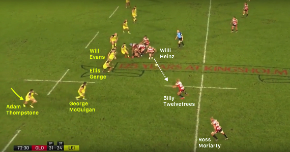 But Evans does not have a chance to contest on the floor. McGuigan swings around Twelvetrees and hurls himself back towards the ball as Moriarty and wing Henry Purdy resource the ruck for Gloucester: