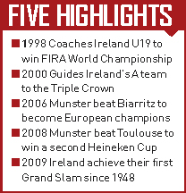 His next step on the coaching ladder saw him steer Dolphin from the lower reaches of AIL Division Two to Division One and in 1997 he became co-coach of Munster, stepping up to head coach a year later. In that same year his Ireland U19 side – featuring Brian O’Driscoll and Donncha O’Callaghan – won the 34-team Junior World Cup.