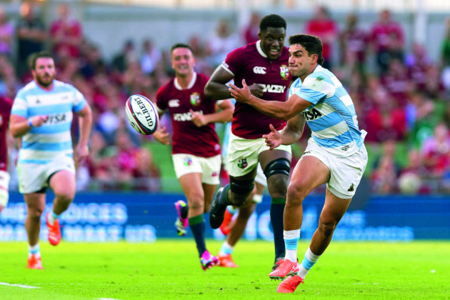 Santiago Carreras of Argentina passes the ball during the 1888 Cup international match between British & Irish Lions and Argentina at Aviva Stadium (Photo by Gaspafotos/MB Media/Getty Images)