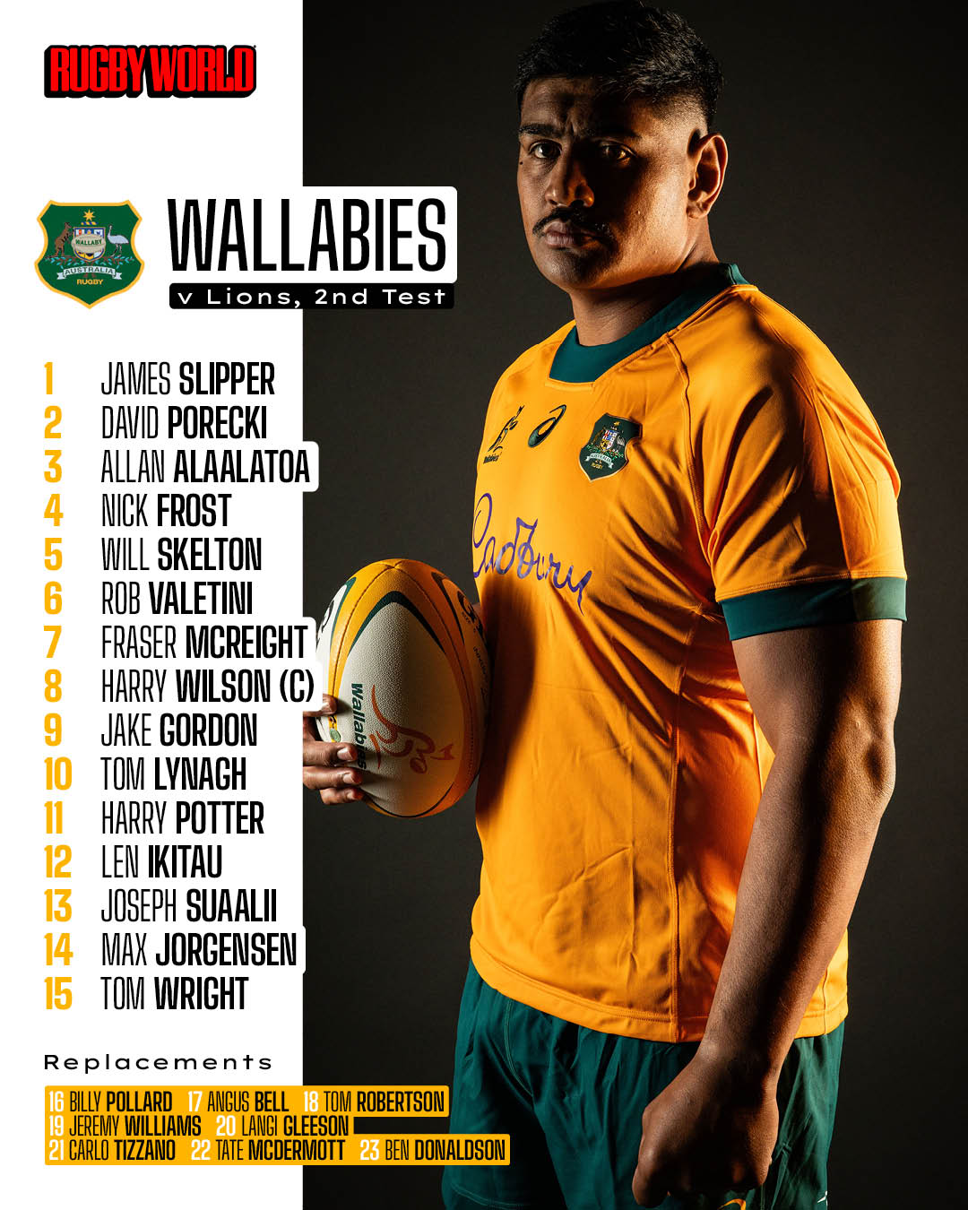 15 Tom Wright, 14 Max Jorgensen, 13 Joseph Suaalii, 12 Len Ikitau, 11 Harry Potter, 10 Tom Lynagh, 9 Jake Gordon; 1 James Slipper, 2 David Porecki, 3 Allan Alaalatoa, 4 Nick Frost, 5 Will Skelton, 6 Rob Valetini, 7 Fraser McReight, 8 Harry Wilson (captain)