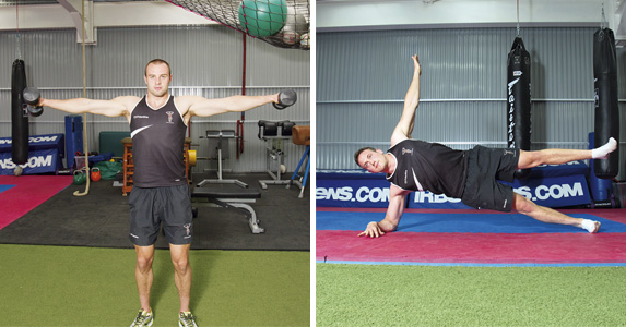 - When performing the dumb-bell lateral raise (left), keep your chest up and dumb-bells to your side