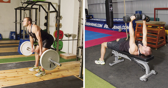 - Lower the bar as far as your hamstrings will allow I Dumb-bell bench press (right): weights shoulder-width apart I Lower to just below shoulders, keeping lower arms parallel