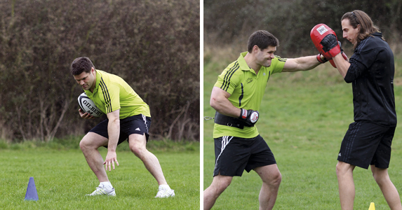 Working in a 10m grid, start and finish each set of shuttle sprints with quick-fire hands on the punch pads. Concentrate on speed not power.