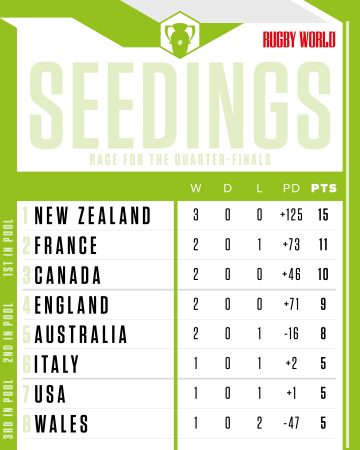 We now know five of the eight quarter-finalists. Canada, England and New Zealand booked their places in the knockout stages last weekend while Australia and France put their names in the line-up with their wins on Saturday.